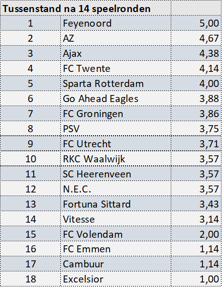 De tussenstand in de Eredivisie na 14 speelronden: